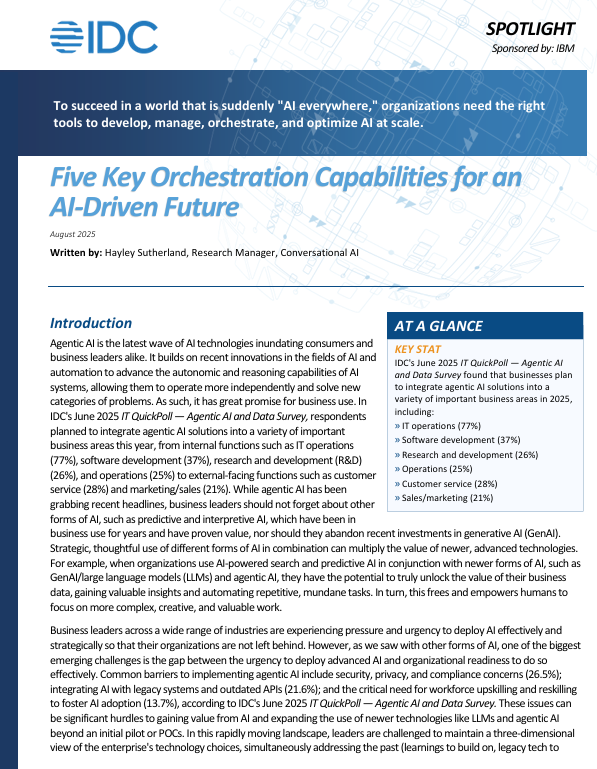 Five key orchestration capabilities can help organisations achieve this goal: data readiness, skill gap mitigation, infrastructure support, use case alignment, and rapid deployment. Together with IBM watsonx Orchestrate, these capabilities help close the gap between AI ambition and execution, enabling faster time-to-value, reduced risk, and more consistent business impact from AI investments.