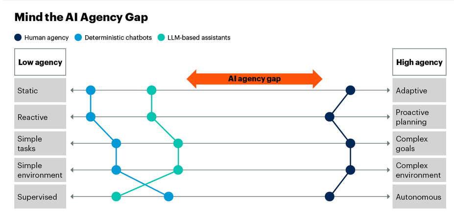 Furthermore, Gartner states, “Until now, AI models such as large language models (LLMs) have performed tasks including generating text and summarizing documents, but they haven’t been able to take action by themselves on their own ‘initiative.’ Instead, they’ve acted on your prompts. Agentic AI is changing that.”